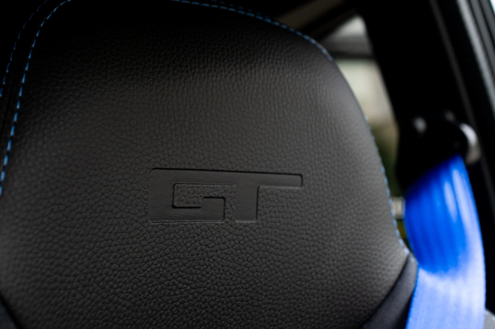 | Tapițerie trimaterială „GT” cu cusături albastre și logo „GT” în relief pe tetiere |